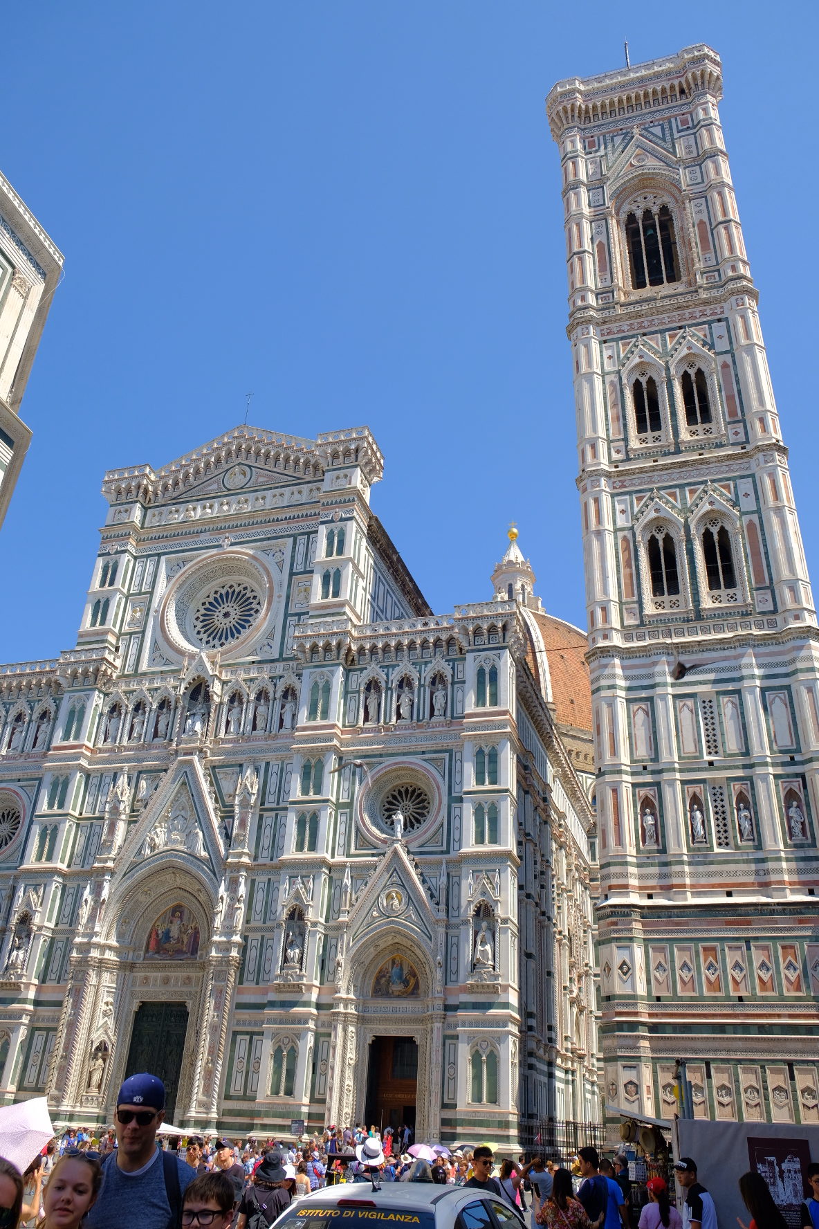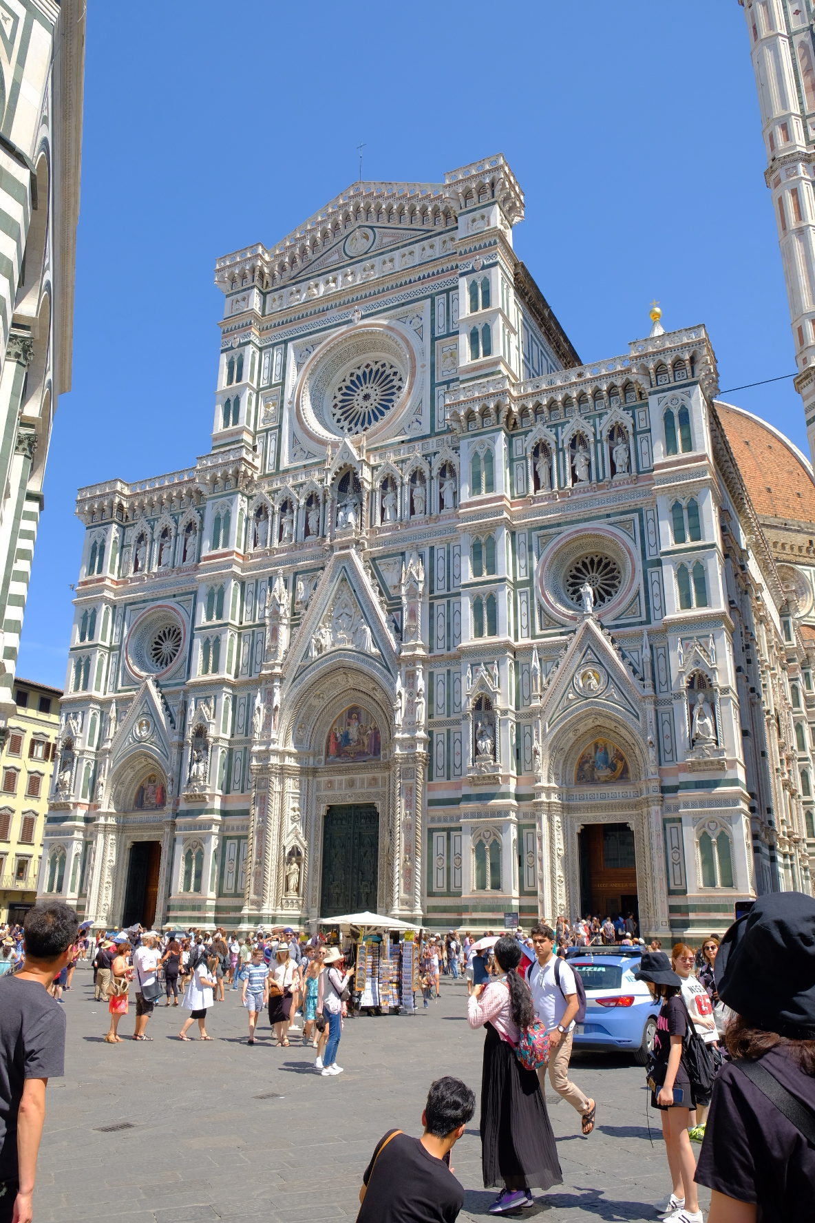 右にある高い建物が「ジョットの鐘楼」。階段で400段上がっていくと町を一望する絶景が見れます。時間がなかったので、大聖堂の中もジョットの鐘楼も入ることができず、悔いが残ります。また行く機会があれば行きたいです。